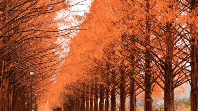 なんといっても外せないのは、滋賀県を代表する紅葉スポット「メタセコイア並木」です。約500本のメタセコイアが道路沿いにずらりと並び、まるで絵画のような絶景が広がります。まっすぐ伸びた並木道は、ドライブにもサイクリングにもぴったり。秋には、メタセコイアの葉が黄金色に染まり、まるでトンネルのような幻想的な空間を作り出します。小さなお子さんなら、道端で落ち葉を拾ったり、広場で遊んだりして楽しむことができます。