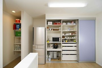 実際には、冷蔵庫までを隠してしまう(収納してしまう)ことは出来ませんが、奥行きが約50cmくらいあって、正面は床から天井までのシースルーの引き戸が付いているので、急な来客時にも、扉を閉じれば中が見えてしまうことはありません。