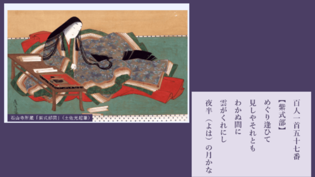 現代語訳:せっかく久しぶりに逢えたのに、それが貴女だと分かるかどうかのわずかな間にあわただしく帰ってしまわれた。まるで雲間にさっと隠れてしまう夜半の月のように。