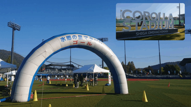 コースは、近江八幡らしい田園コース。雲一つない最高の秋晴れの下を、風を切って走ります。周りのランナーの方々も楽しそうで、その一体感に背中を押され、気づけば自分のペースで軽快に進んでいました。そして目指すゴールはカローラ滋賀はちまんスタジアムです。スタジアムではブラスバンド部の演奏と応援の人たちが走者を迎えてくれました。最後に力を振り絞って走っていると、すでに走り終わった小学生中学生の子たちがコーナーに座って「あと少しやで~がんばれ~」と声援を送ってくれました!!