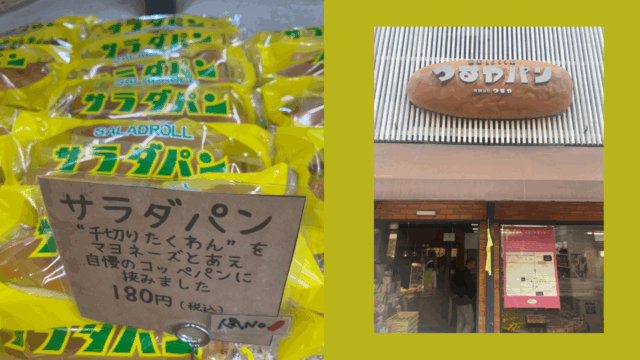 ここで買わずには帰れないのが、名物**「サラダパン」**です!「サラダ」なのに中身はなんと、千切りたくあんのマヨネーズ和え! この強烈な個性を持つ惣菜パン、初めて食べる方は「え?」と思うかもしれませんが、これが本当に美味しいんです。ふわふわのコッペパンと、シャキシャキとしたたくあんの食感、そしてマヨネーズのコクが絶妙にマッチして、一度食べるとクセになる味わい。
