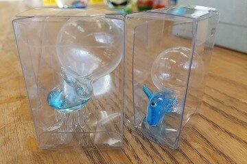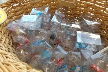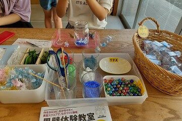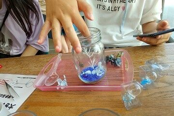 「ステンドグラス体験」「デコレーションオルゴール体験」「吹きガラス体験」など。うちの子供達は今回はその中で「クラゲリウム体験」を選びました!ガラスの魚が、クラゲのようにゆらゆら揺れるカワイイ水族館「クラゲリウム」。作成時間の目安は約15分。気軽に作れて、長く飾れるアイテムです!