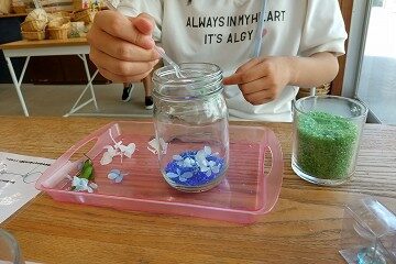 ②お好みでビンにガラスビーズや草や造花など入れていきます。