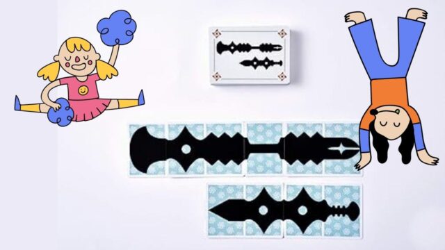 6枚の素材カードを全て使い、裏返したり、回転させたり、重ねたりしながら組み合わせて、他の人より早く依頼カードと同じ「つるぎ」を作ります。できそうでできないもどかしさとドタバタ感がクセになる、スピード勝負のパーティーパズルゲームです。2~5名で遊べます。
