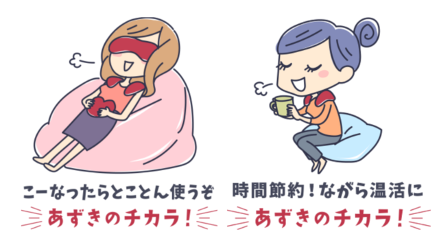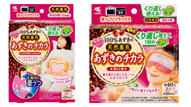 使い方は簡単です。レンジでチンするだけ(600Wで30秒、もしくは500Wで40秒)。お手軽さが素晴らしい! 使用期限は250回(平日に毎日使えば約1年もつ!)と経済的です。色んな形の商品が売っていますが、とりあえずどれか1つあったら、それを目に当てたりお腹、肩、腰とどこでも使えます。