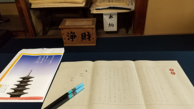 最後まで書いたら、自分のお願い事を追記します。例えば娘の合格祈願であれば、「為」の文字の後に「娘の名前」「合格祈願」「也」と書き加えます。そして自分の住所+氏名+書いた日にちを追記して終了です。(写経セットに詳しく書いた紙が入ってます)書き上げたものはお部屋の指定場所に置いて帰ります。