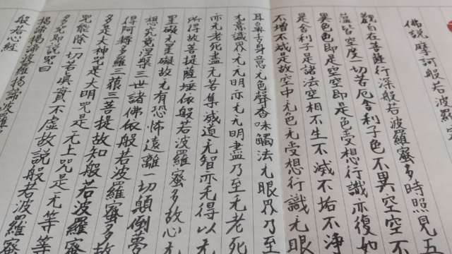写経は文字も多いしたいへんそうですが、実際にやってみると意外と最後まで書けます。1時間があっという間に過ぎてしまいます。筆ペンで文字をなぞるので誰でもキレイに仕上がります♪文字をなぞる事に意識をフォーカスするのではなく、文字を書いているわたしの在り方に目を向けて書いていると筆が和紙を滑る音が聞こえるようになります。筆先が和紙にあたり、墨がゆっくりと染み込んで伝わって行く感じが指先を通じて感じられます。わたしを「今」に留めるような静かな時間を是非楽しんでください^^