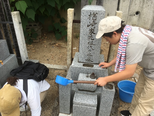 丁寧に墓石を洗ったり、草引きをして