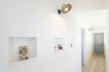 また、廊下や階段周りなどに、絵や小物を飾るために、いくつかの小さなニッチを設けたいというご要望も多くいただきます。ニッチの大きさや、小さな埋め込み照明の有無、四方をクロス巻き込みにするのか、木製枠で回るのかなど、細かな仕上げの違いにもよりますが、30cm角のクロス巻き込み仕上げなら、1か所5000円~10000円もあれば、十分に作ることができます。