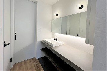 今回のオーナーさまも、洗面台には非常にこだわられていて、玄関からの動線上にウォークスルーの造作洗面台を採用されています。グレーのカウンターに真っ白のスクエアなボウル、ブラックの水栓は見た目もカッコ良く、シンプルな造りですが質の高さを感じさせます。