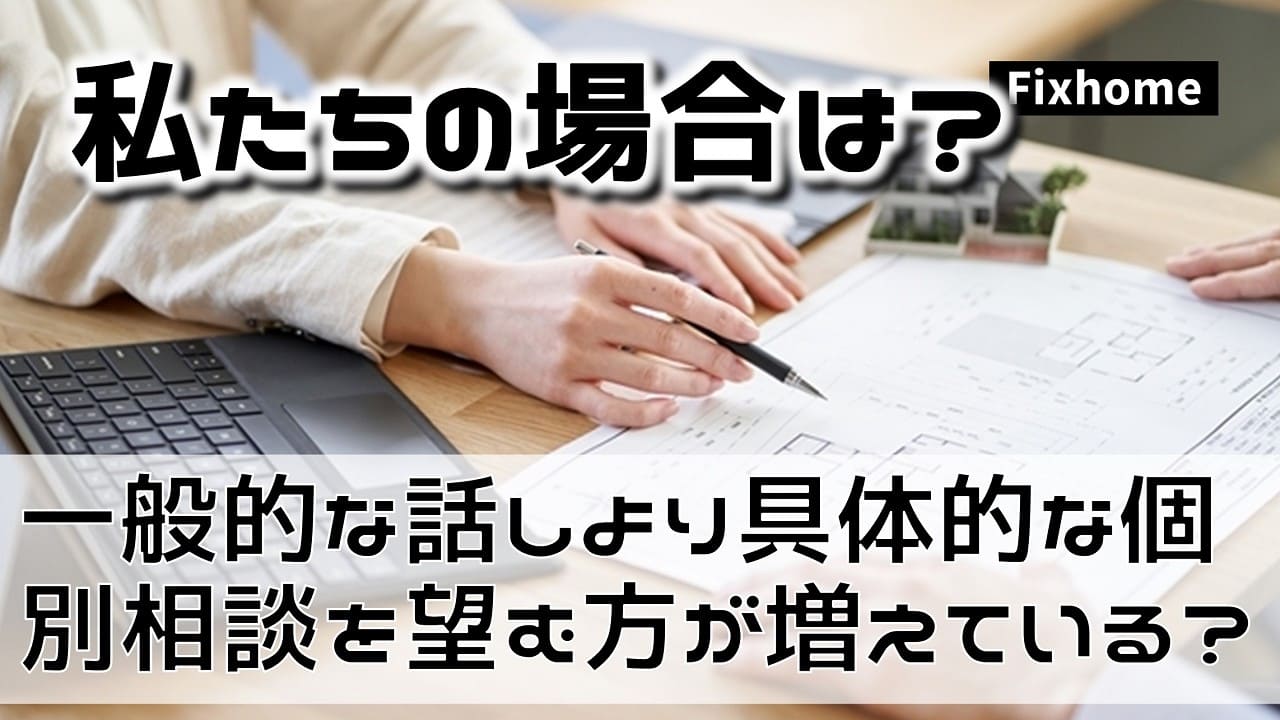 今回は、最近、多くの方が利用され始めた個別相談についてまとめてみました。個別相談は、あくまで「相談」であって「商談」ではないというのがフィックスホームの考え方です。家づくりに関する悩みや不安、疑問を解決するために相談にのらせていただくというスタンスです。何か気になることがございましたら、遠慮なくご相談ください。