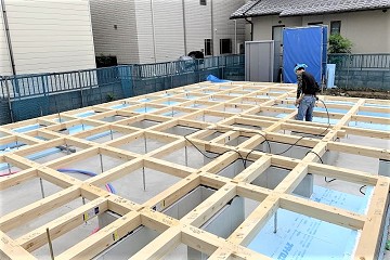 上棟工事日に雨が降らないのはもちろんですが、無事に上棟工事を迎えるには、最低でもあと3日ほどの準備日数が必要です。上棟工事日の前日には、足場の組み立てが行われます。さらにその前日と前々日には、「土台引き」と言って、基礎コンクリートに対して、土台や断熱材の施工を行った上で、さらに1階の床下地を張り上げ、材木屋さんから上棟当日に組み立てる木材の搬入をしてもらって準備が整います。