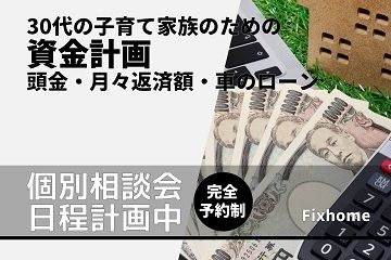 そして同じような間取りの完成見学会に何度参加して勉強しても、本当に大事なことが解決しない、家づくりが前に進まないと、あきらめてしまうことが多いのです。そんなご家族の役に立ちたいと、自らも住宅ローンを実際に組み、毎月支払いを継続中のフィックスホームの住宅コンサルタントによる、「30代の子育て世代3~5人家族の成功する資金計画」個別相談会を開くことになりました。