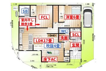 また、リビングは17畳の空間に、床下エアコンや小屋裏エアコンの効果を高めるためのリビング階段に、4畳の吹き抜けも設置されています。将来は平屋のように暮らせるというだけあって、主寝室6畳に加えて、さらに6畳の洋室がもぅ1室あります。