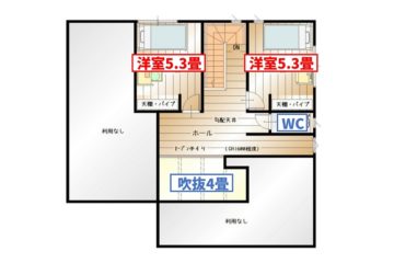 2階の間取りは、同じ広さのお子さま用の部屋が2室と、トイレや吹き抜けから続くホール部分で構成されています。1階のリビングから勾配天井で続く2階のホールは、天井部分が少し低くなっていて、一見ロフトのようにも見え、お子さま達も隠れ家気分で大満足です。