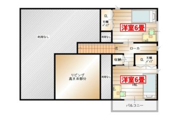 2階の間取りは、いたってシンプルです。洋室6畳が2室のみで、新築時には2階のトイレも不要とのことでしたが、もし暮らしてみて、どうしても必要だと感じたら作れるように、階段を上がった廊下の突き当りに、トイレスペースを取れるように、あえて空間を残しました。