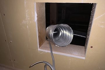 こちらの画像は、小屋裏空間から下を見下ろした様子です。今回の現場では、小屋裏空間の真下が、2階ホールに面したファミリークローゼットになっています。ここから暖かい空気を小屋裏へ供給します。脱出映画に出て来そうな感じですよね。