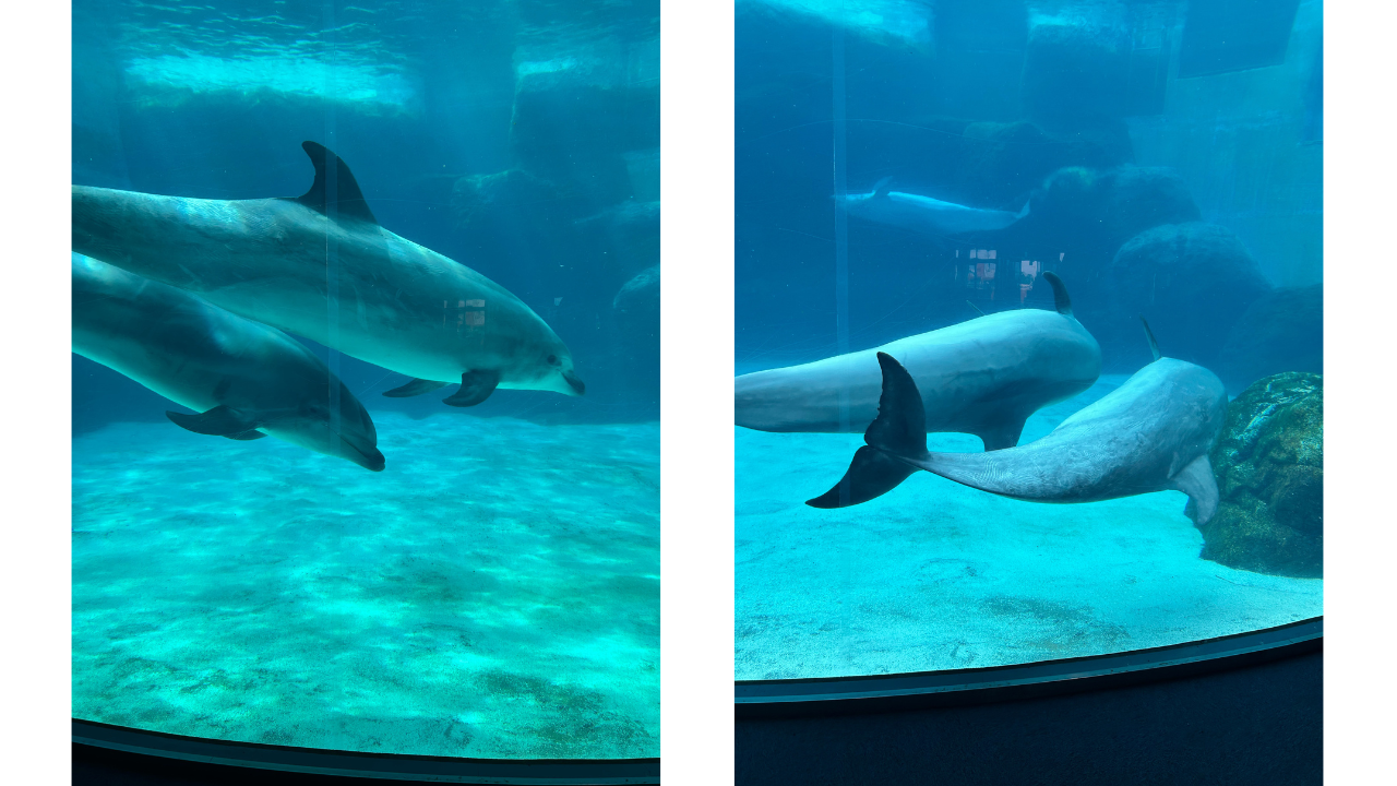 そして、イルカのプールでは、元気いっぱいのイルカたちがジャンプしたり、くるくると回ったり、親子で仲良く泳いでいるイルカたちもいました(*^^*)