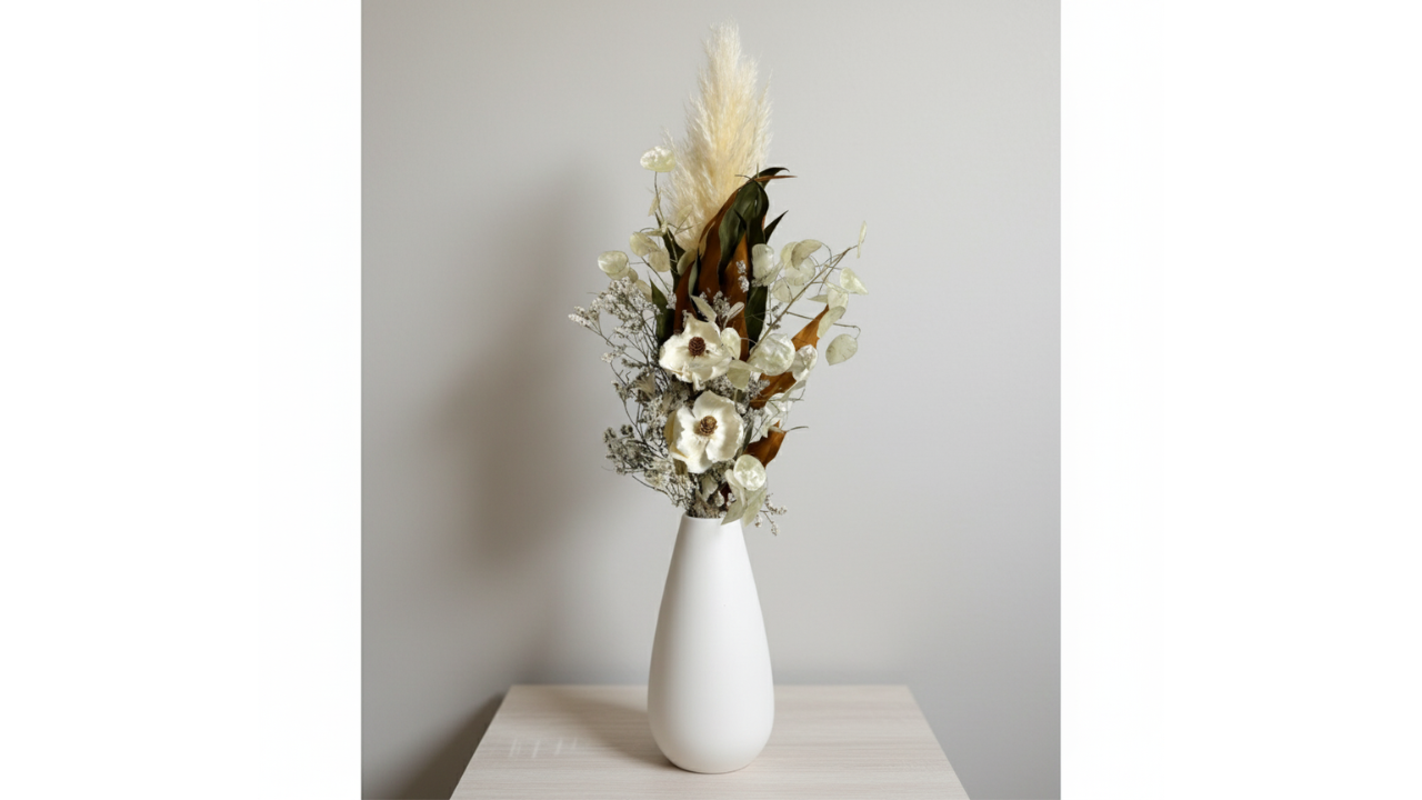 陶器の花瓶でこれにしようかな~と思ってみていたものがあったので、ドライフラワーの写真と検討中の花瓶の画像を送り、「この花瓶にこのドライフラワーを飾るのは合うかな?イメージ画像を作ってみて」とお願いしました。