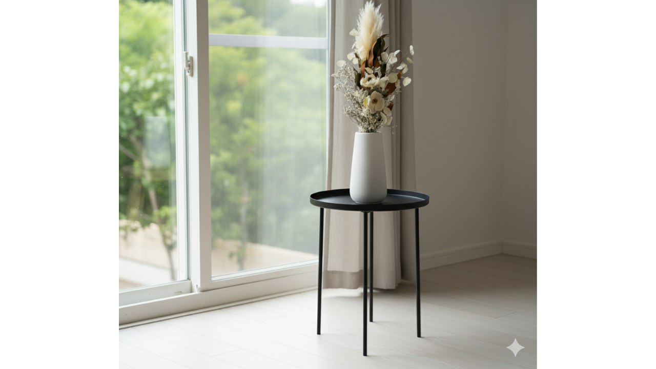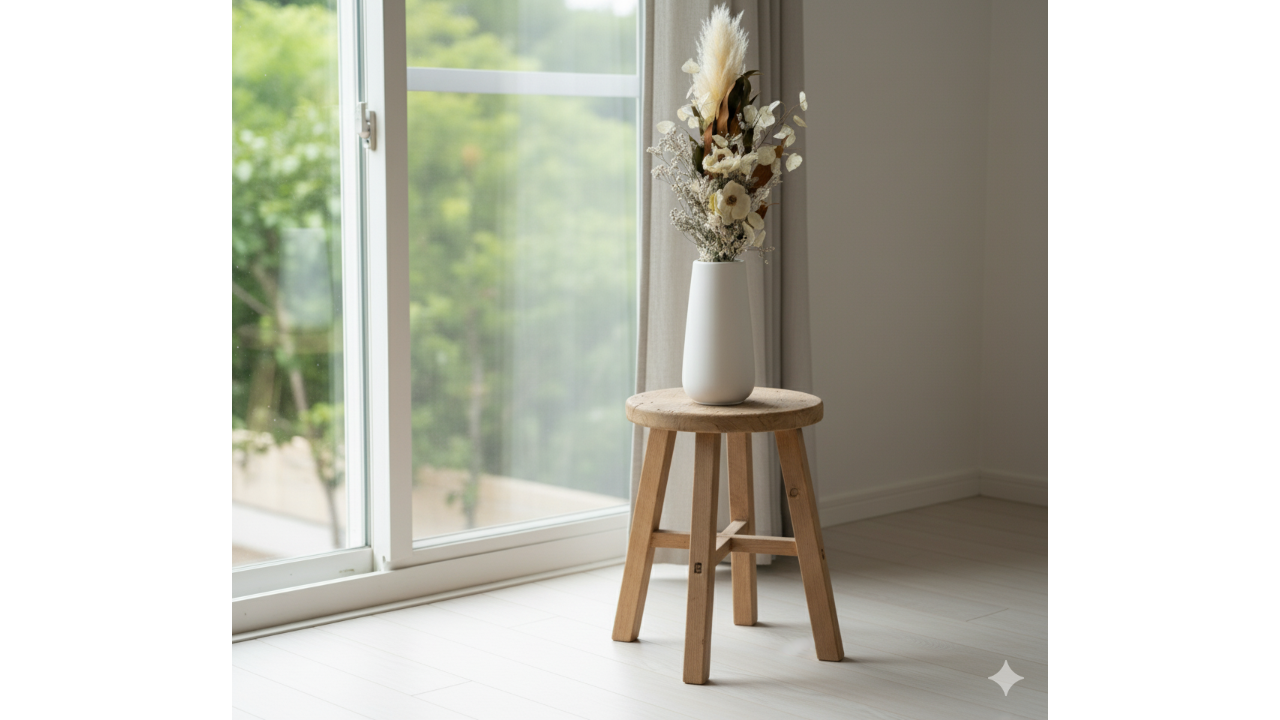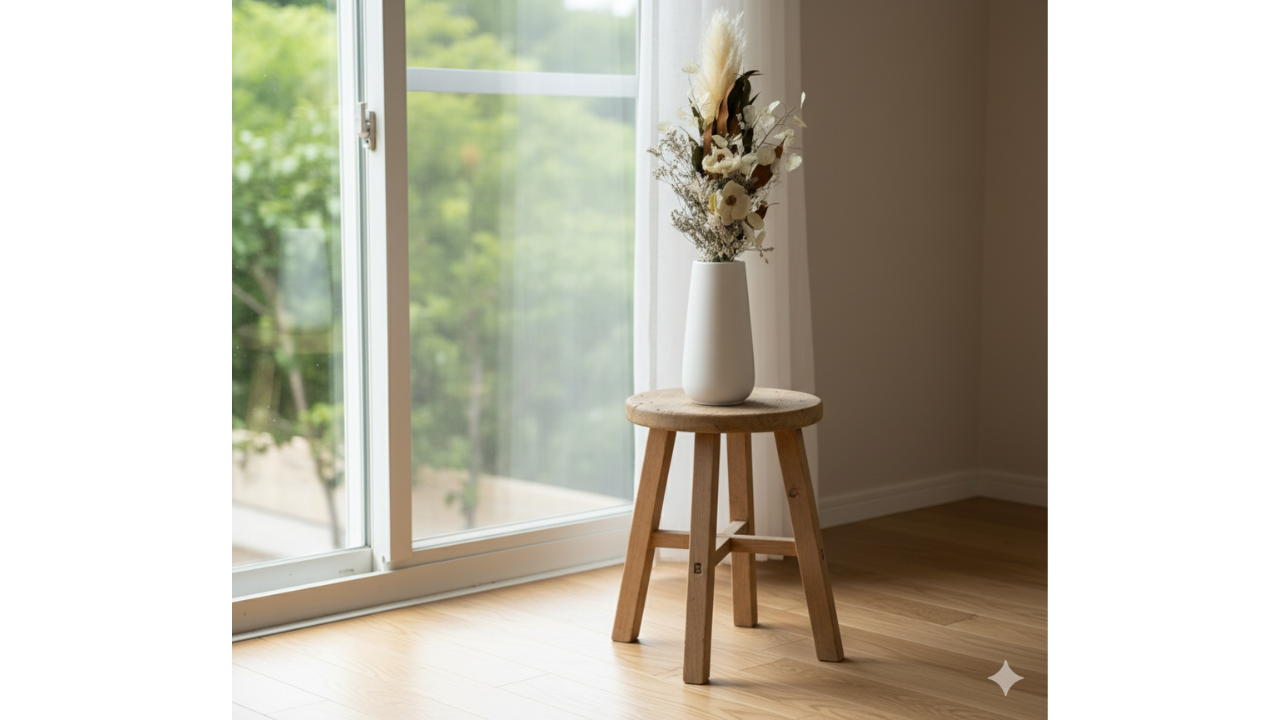 「掃き出し窓のそばに、高さ28cmの白い花瓶とドライフラワーを飾った、木製スツールを配置したLDKの画像を作って」