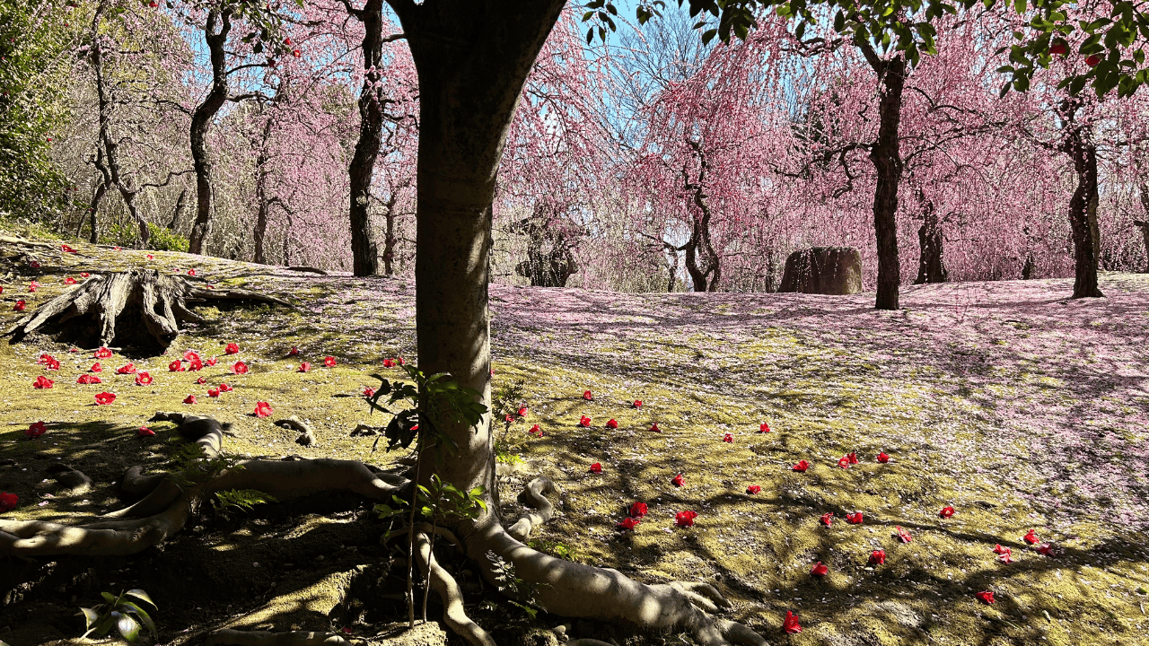 絶景!しだれ梅と落ち椿