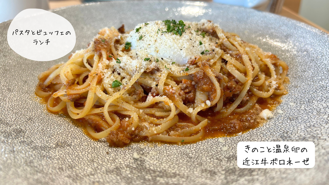 メインの選べるパスタに約20種類の前菜ビュッフェが付いたランチ限定メニューで、パスタは『きのこと温泉卵の近江牛ボロネーゼ』にしました♪