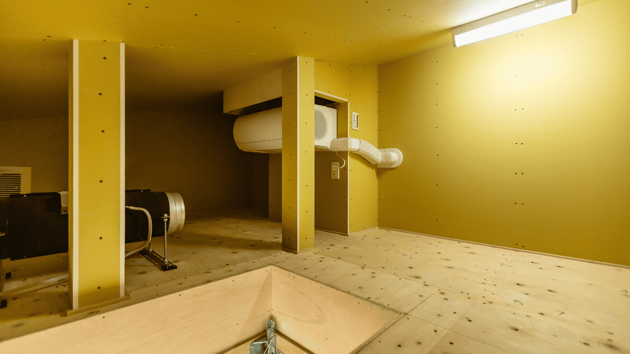 夏は小屋裏エアコン一台だけを稼働させ、家中の冷房をまかないます。冬は洗面脱衣室に設置されている、床下エアコンを稼働させます。