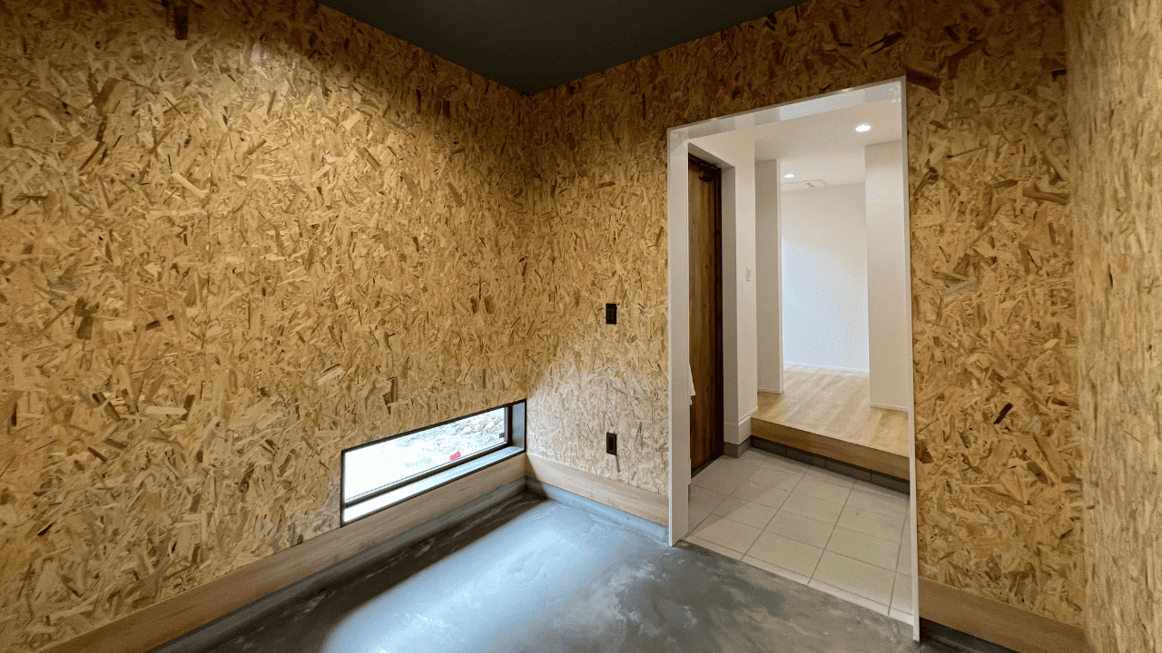 汚れが目立ちにくいよう、クロスではなくOSBボードを貼りました。