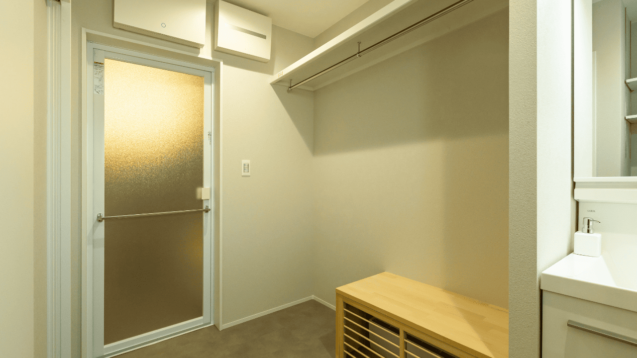洗面脱衣室は少し広めの空間を取り、普段よく着る洋服は掛けておけるようにしました。