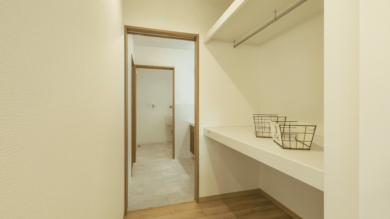 ファミリークローゼットから、洗面室、脱衣室兼ランドリールーム、バスルームへと続く動線✨