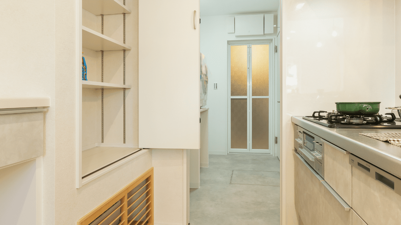 パントリーもあるので、買いすぎてしまっても大丈夫。下部は床下エアコンを設置しています。