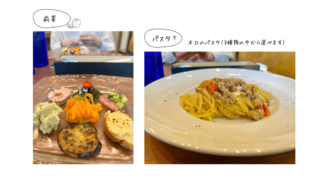 Aコースは、前菜、スープ、本日のパスタ、パン、ドリンク、デザートがコースになっています。